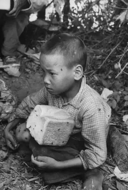图为在香港一侧的山上,香港市民给一位从深圳逃过来的小难民送来面包。