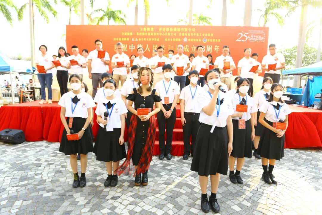 典礼开场全体人员面向国旗齐唱《国歌》,慷慨激昂的《义勇军进行曲》唤起对祖国的热爱和民族的自豪。典礼最后香港创作歌手冯㬢妤小姐、天主教鸣远中学合唱团与全体人员高唱《歌唱祖国》,祝愿伟大祖国繁荣昌盛。高亢的歌声响彻全场,感染了每一位在场人士,充分体现了香港同胞心向祖国、祝福祖国的爱国之情。