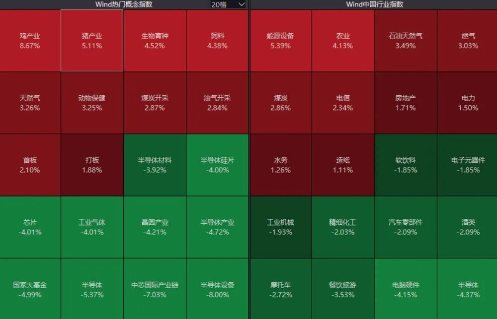 板块方面,养殖板块全线爆发,鸡产业、猪产业、生物育种强势领涨,多股涨停。另外能源相关板块集体走强,天然气、煤炭开采、油气开采等概念涨幅居前。受消息影响,半导体、芯片板块一片“绿油油”跌幅居前,多只千亿大白马跌超10%。