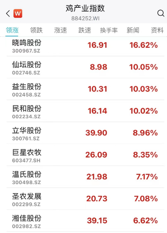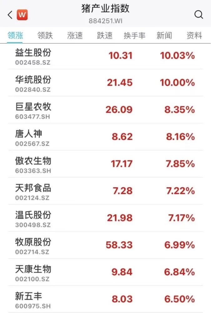 10月10日 ,养殖板块全线爆发,鸡产业、猪产业、生物育种强势领涨,益生股份、华统股份涨停,傲农生物、牧原股份、温氏股份、天邦食品等均涨超7%。