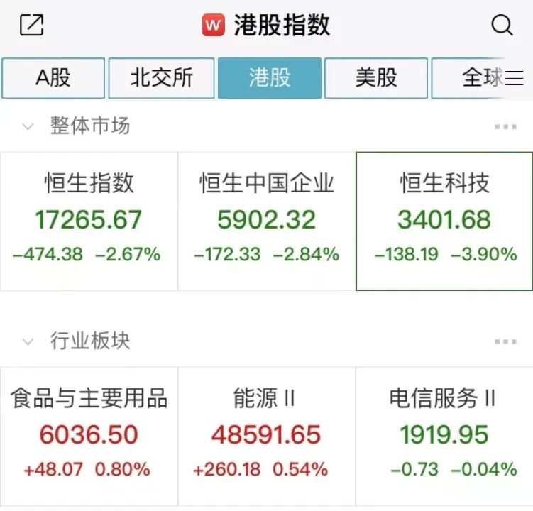 港股市场在经历了10月5日史诗级暴涨后,今日开盘却表现不佳,三大指数集体下跌。截止发稿,恒指跌2.67%,国指跌2.84%,恒生科技指数跌3.9%。