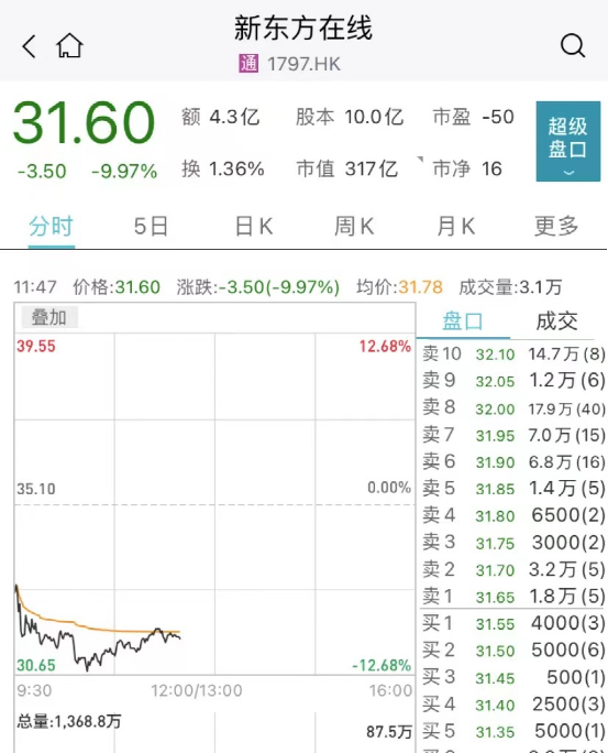港股教育股走低,新东方在线一度跌超12%,天立国际控股、新东方、宇华教育等跟跌。