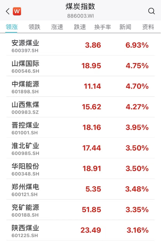 煤炭板块拉升,安源煤业、山煤国际、中煤能源涨超4%。