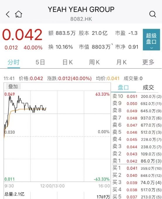 遭控股股东清仓式“退出”后,开启暴涨模式。在经历了前一个交易日暴涨130.77%后,YEAH YEAH GROUP(前身为“太阳娱乐集团”)今日再度大涨,盘中涨幅一度超60%,不过随后涨幅收窄至36%。