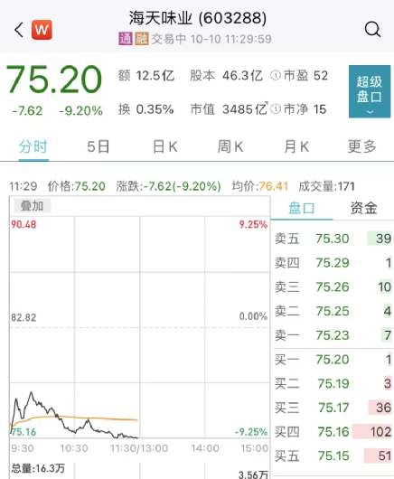 焦点股方面,深陷添加剂“双标”风波的海天味业今早低开,截至午间收盘,该股报75.2元,跌9.2%,最新总市值为3531亿元,市值较开盘蒸发超300亿元。