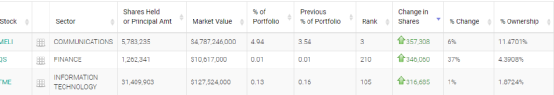 此外,根据wind数据,截至2022年6月30日,柏基投资为腾讯音乐的第三大机构投资者。截至三季度末,柏基投资已增持32万股腾讯音乐。增持后,柏基投资持有约为1.28亿美元(折合约9.28亿人民币)市值的腾讯音乐股票,占其组合的0.13%。