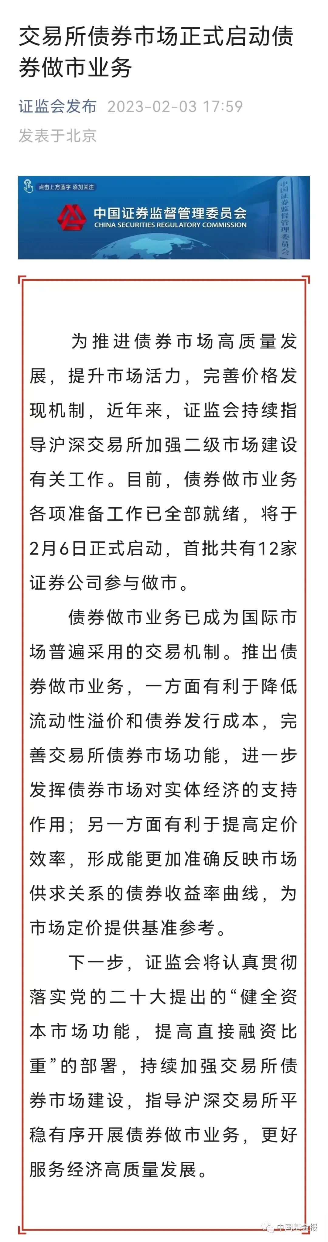 2月3日晚间,证监会发文称,交易所债券市场将于2月6日正式启动债券做市业务。目前,债券做市业务各项准备工作已全部就绪,首批共有12家证券公司参与做市。