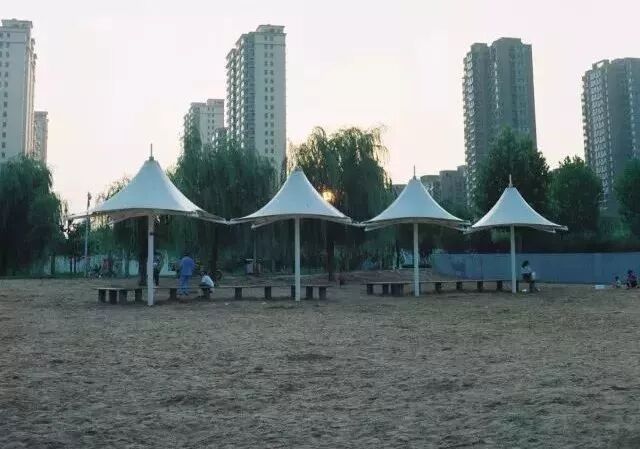 沭河边上新建的休闲场所,后面是村庄拆迁后的安置房