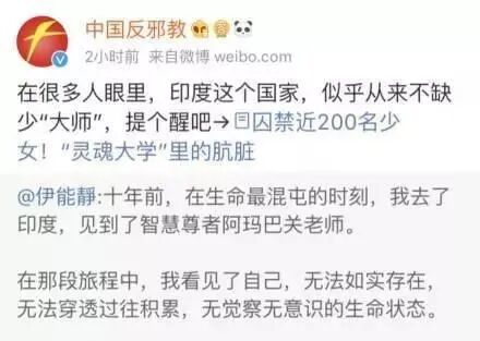 员工内部出问题,上层给出的解决措施也是「高潮一下就好了」。直到这部影片拍摄时,片方联系到相关高层后,得到的仍旧是混淆是非,强词夺理的回应。他们坚称所有指控都是不实的,所有活动都是自愿参加且双方同意的。而且,据称,创始人妮可正在寻找代笔作家为自己洗白。但实际上,人性是相通的,利用人性的弱点投机、敛财的现象也是全球性的。甚至「裸体瑜伽」的邪教模式也早在上世纪的罗马尼亚就出现了。前两年,曝光过一批所谓的「身心灵」培训机构,同样打着灵修、瑜伽等招牌。以性解放的名义,高价兜售涉嫌淫秽色情的课程,足迹遍及多个城市。而且更高级的课程,也是群体派对形式,但都会偷偷在国外举行。但很快,中国反邪教和中国警方两大官微点名批评伊能静。一段时间后,印度当地一则报道称,这位「大师」因逃税被查。家里搜查到了超过60亿卢比(近6亿元)的未披露收入。它们包裹着性愉悦的科学知识,披着女性赋权等进步思潮,迎合着社会焦虑情绪,走在明星带货的传播前沿。尤其是如今,冥想依然被明星、网红大力推崇,已经成了一种时髦的兴趣爱好。也让渴望抓住流行趋势的人一拥而上,忽略了背后可能存在的隐患。