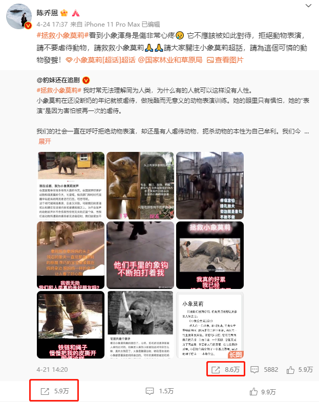 给了「家暴是家务事」「一个巴掌拍不响」等言论一记响亮的耳光。小象莫莉疑遭虐待事件曝光后,陈乔恩的转发直接推动此事大范围出圈。