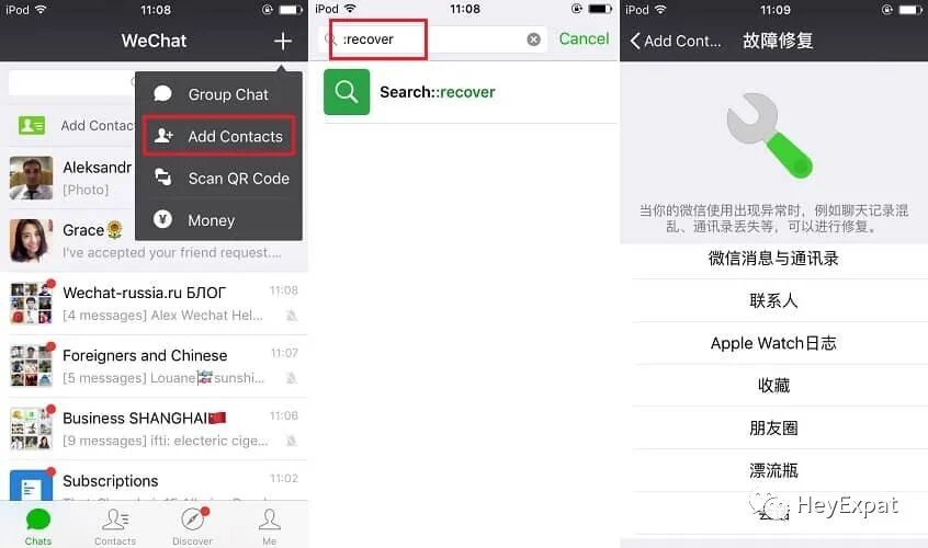 You can now recover data in WeChat via a secret menu for data recovery. First click 'Add New Contact' and search ':recover'. You will then be taken to the WeChat data recovery menu (in Chinese).