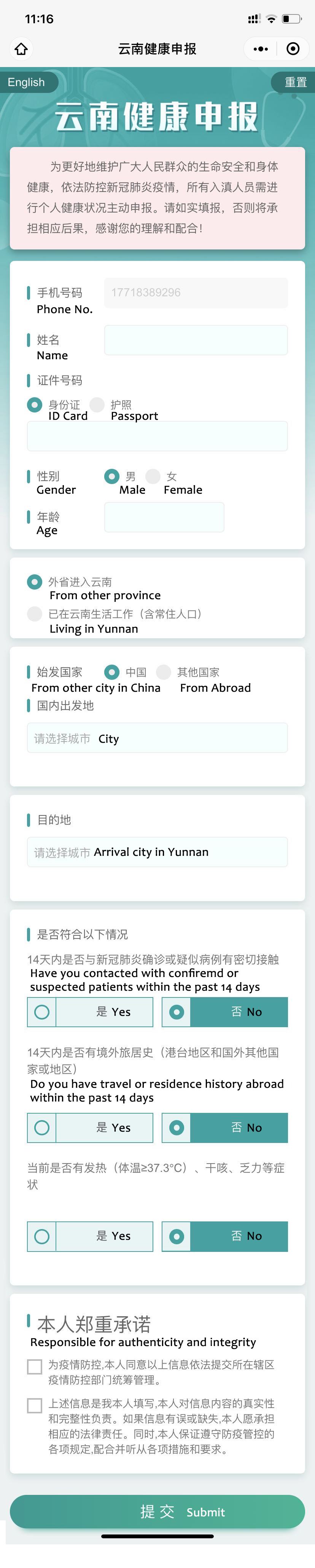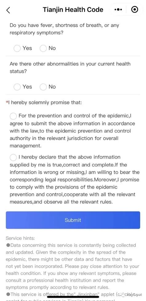Step 3: Once an account is made, you can register to apply for the “Hainan Health Code.” Individuals will then need to answer a series of questions including physical health and travel history, and then click “submit” at the bottom of the form. The system will generate a green, yellow, or red code based on the information you provide.