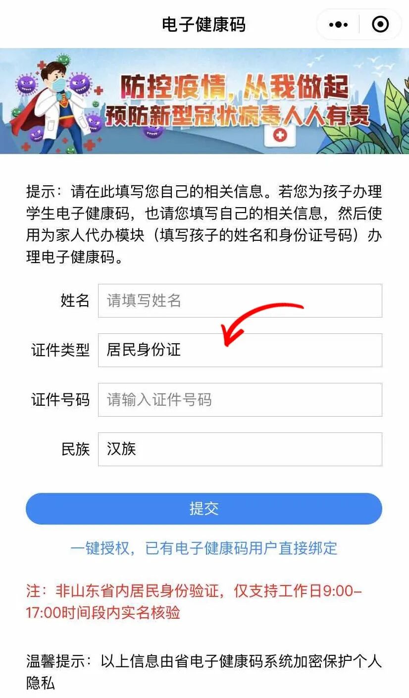 1. Click the menu "健康通行卡" | 2. Click 居民身份证 |