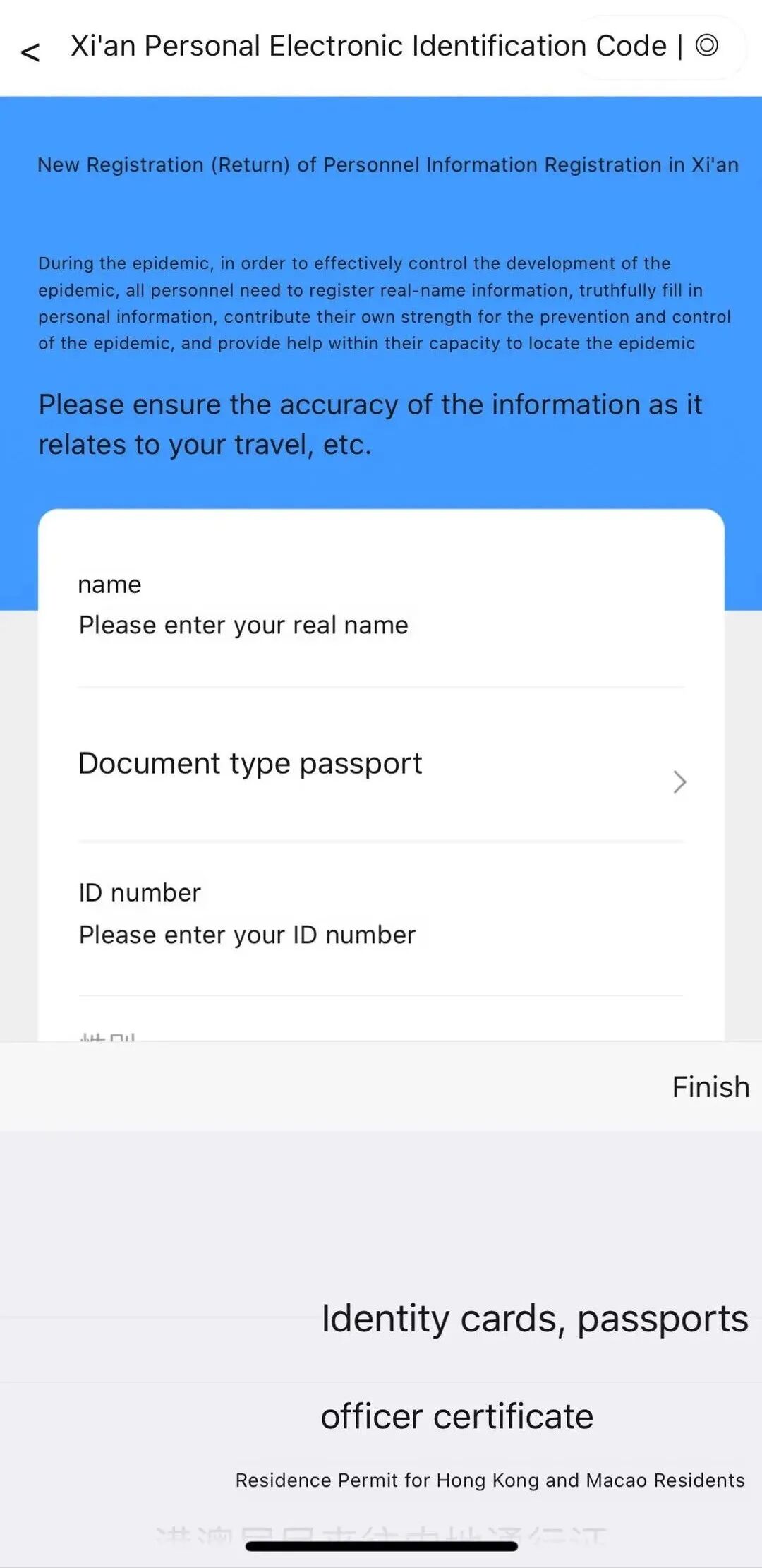 For the sake of verification, the ID information you upload when using the Health Kit should be the same as the one on the photo page of the ID document you used for entering China.