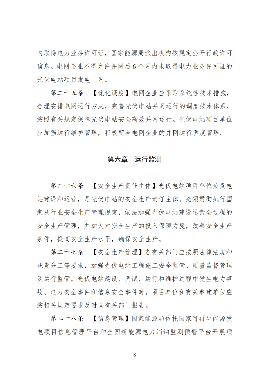 9月5日,国家能源局综合司就《光伏电站开发建设管理办法(二次征求意见稿)》公开征求意见,光伏电站项目应当在并网后6个月内取得电力业务许可证,国家能源局派出机构按规定公开行政许可信息。电网企业不得允许并网后6个月内未取得电力业务许可证的光伏电站项目发电上网。