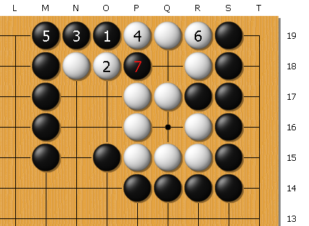 以后黑7在M19提后,P19和R19两点黑必得其一,白无法做出第二只眼