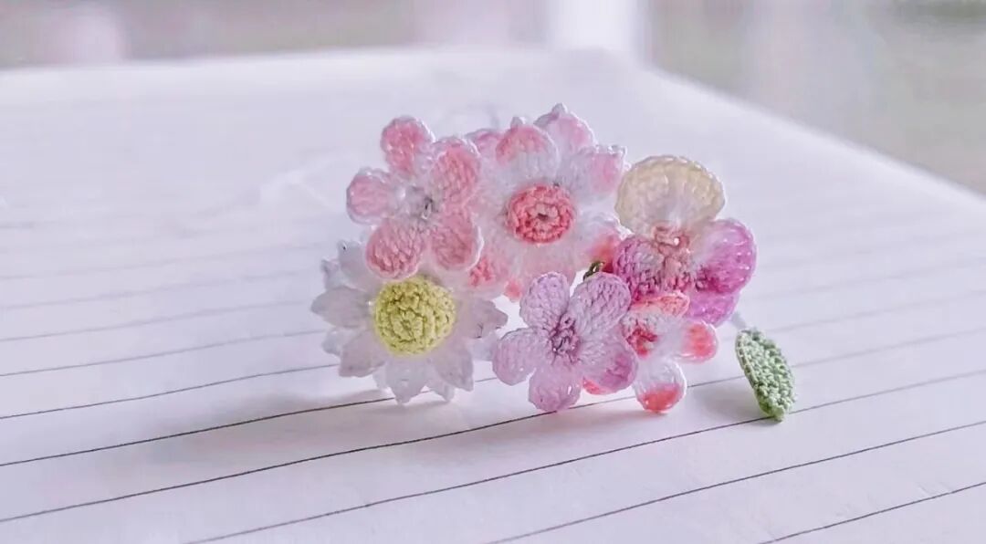 6号蕾丝,用的色线无需染色,采用阿富汗针法,比较复杂但是花的平整度会好些。花瓶插花选取花材、配色以及高低差都很讲究,这个作品还很青涩的。