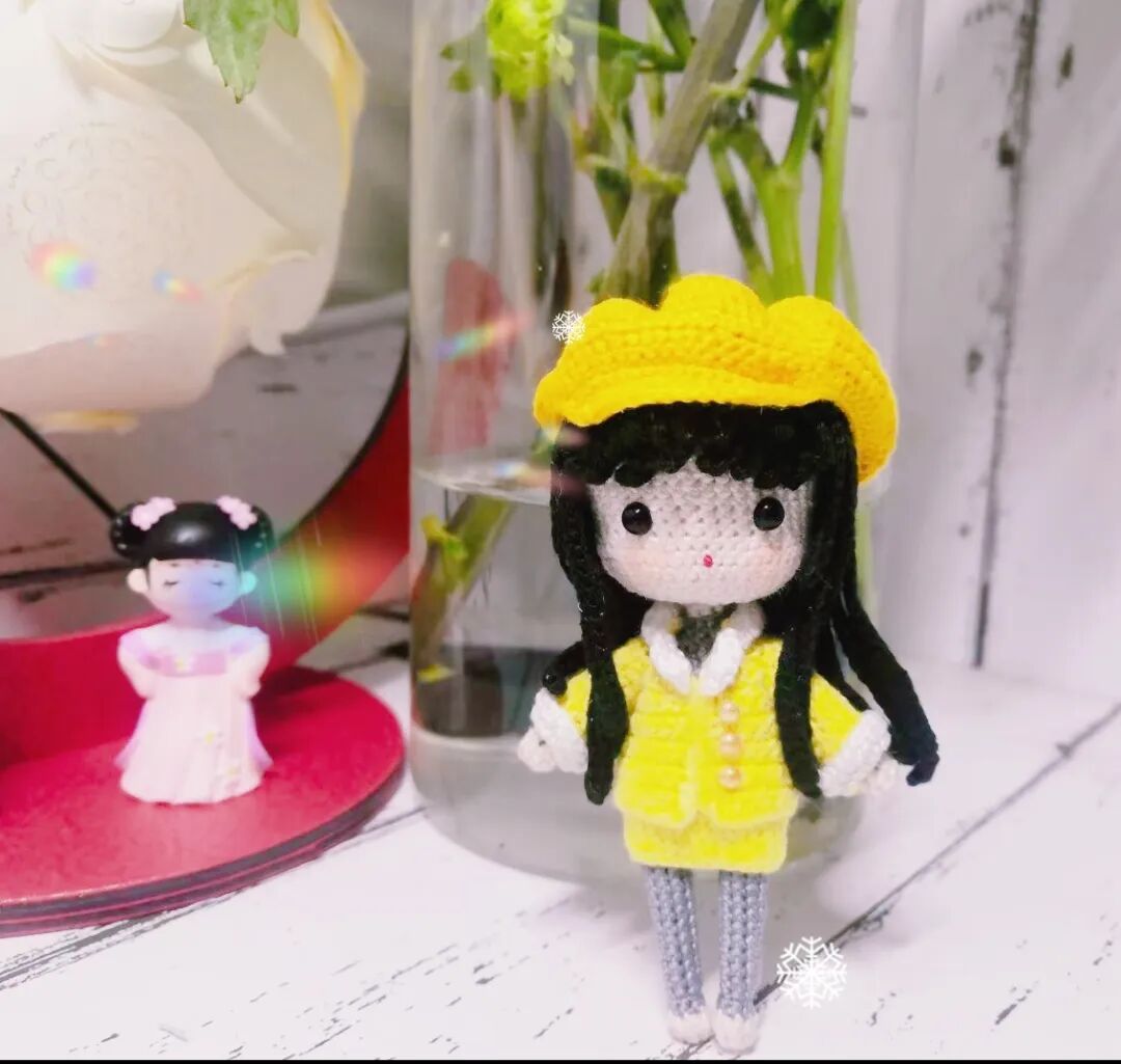 6号蕾丝线钩织,娃娃很小巧,整体难度不大,帽子内侧贴蕾丝花边与外沿花纹呼应,裙子注意捏出褶皱。加入铁丝时要注意放到脚底以便让娃娃能够站立。