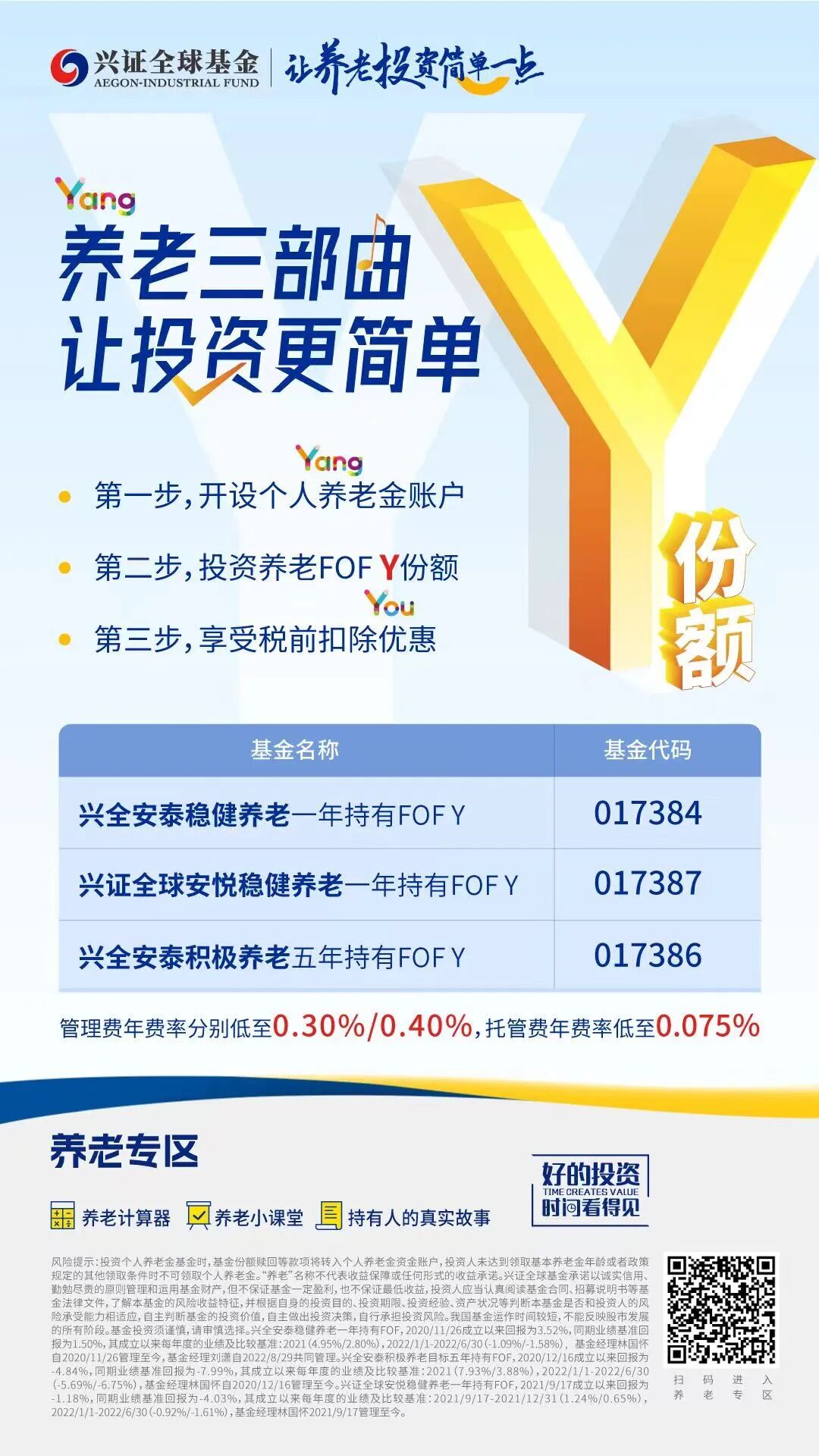 风险提示:投资个人养老金基金时,基金份额赎回等款项将转入个人养老金资金账户,投资人未达到领取基本养老金年龄或者政策规定的其他领取条件时不可领取个人养老金。达到领取个人养老金的条件时,个人养老金投资者需按照投资金额及可能产生的收益全额缴纳3%的个人所得税。以届时国家出台的有关政策为准。“养老”名称不代表收益保障或任何形式的收益承诺。兴证全球基金承诺以诚实信用、勤勉尽责的原则管理和运用基金财产,但不保证基金一定盈利,也不保证最低收益,投资者投资于本公司基金时应认真阅读相关基金合同、招募说明书等文件并选择适合自身风险承受能力的投资品种进行投资。基金过往业绩并不预示其未来表现,基金管理人管理的其他基金的业绩也不构成基金业绩表现的保证,基金收益具有波动性。基金投资有风险,请审慎选择。
