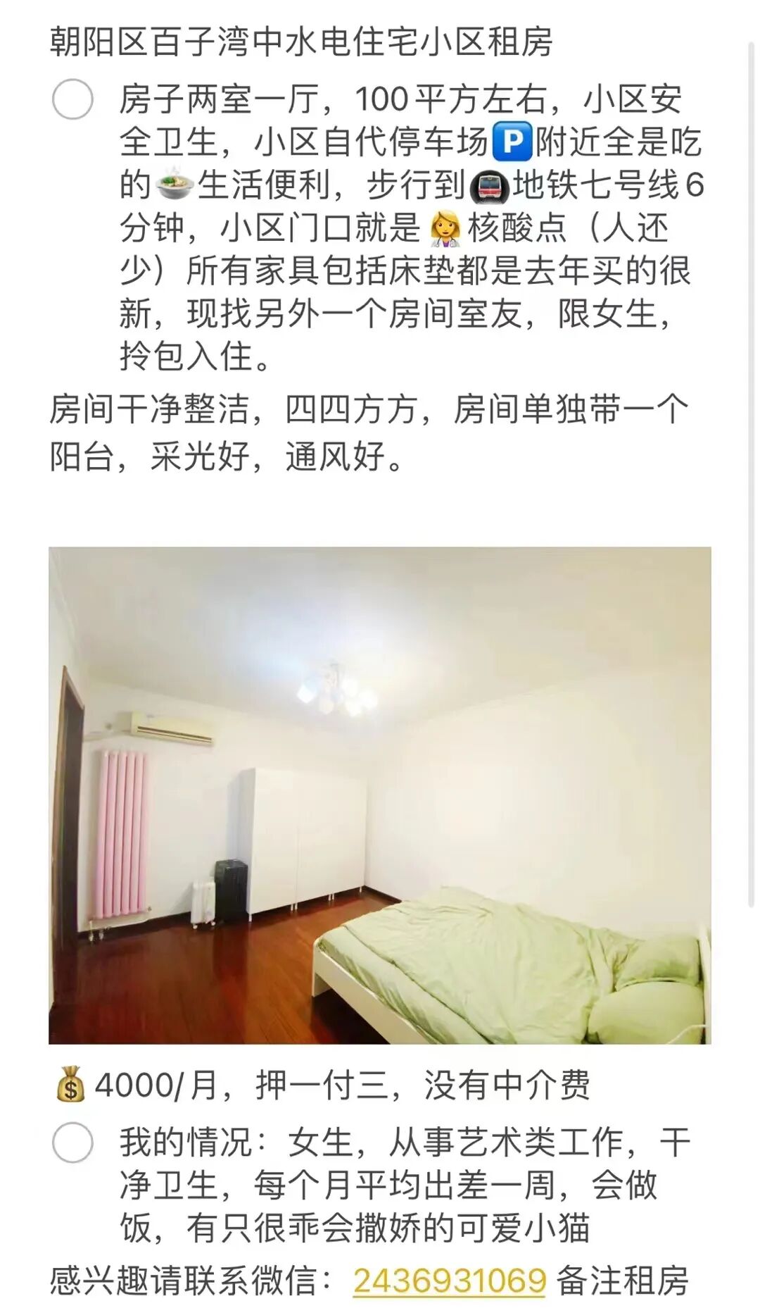详情:近期有没有北京找房的呀,空房间出租,黄金地段,100多平方。两室一厅一厨一卫,有大阳台,通风好采光佳,洗手间干湿分离,超大洗手台。小区自带停车场,步行6分钟到7号线百子湾站,楼下都是吃的和超市便利店,门口就是核酸点(人还少)快递外卖可送上楼,小区干净卫生视野开拓地段好。