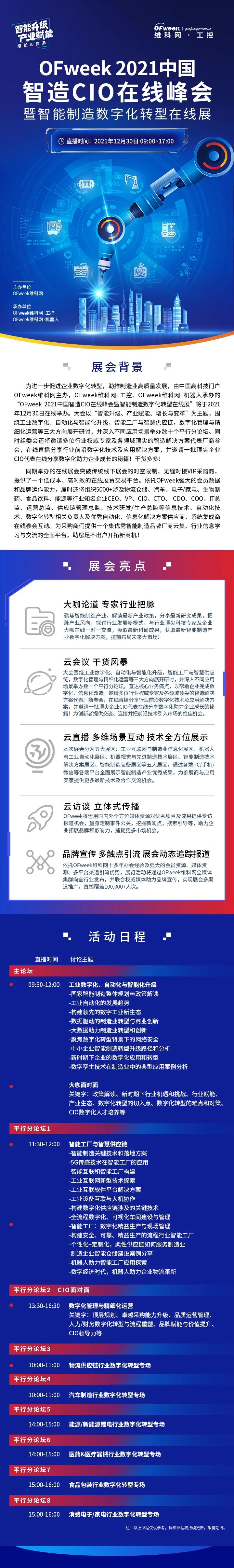 为进一步促进企业数字化转型,助推制造业高质量发展,由中国高科技门户OFweek维科网主办,OFweek维科网·工控、OFweek维科网·机器人承办的“OFweek 2021中国智造CIO在线峰会暨智能制造数字化转型在线展”将于2021年12月30日在线举办。