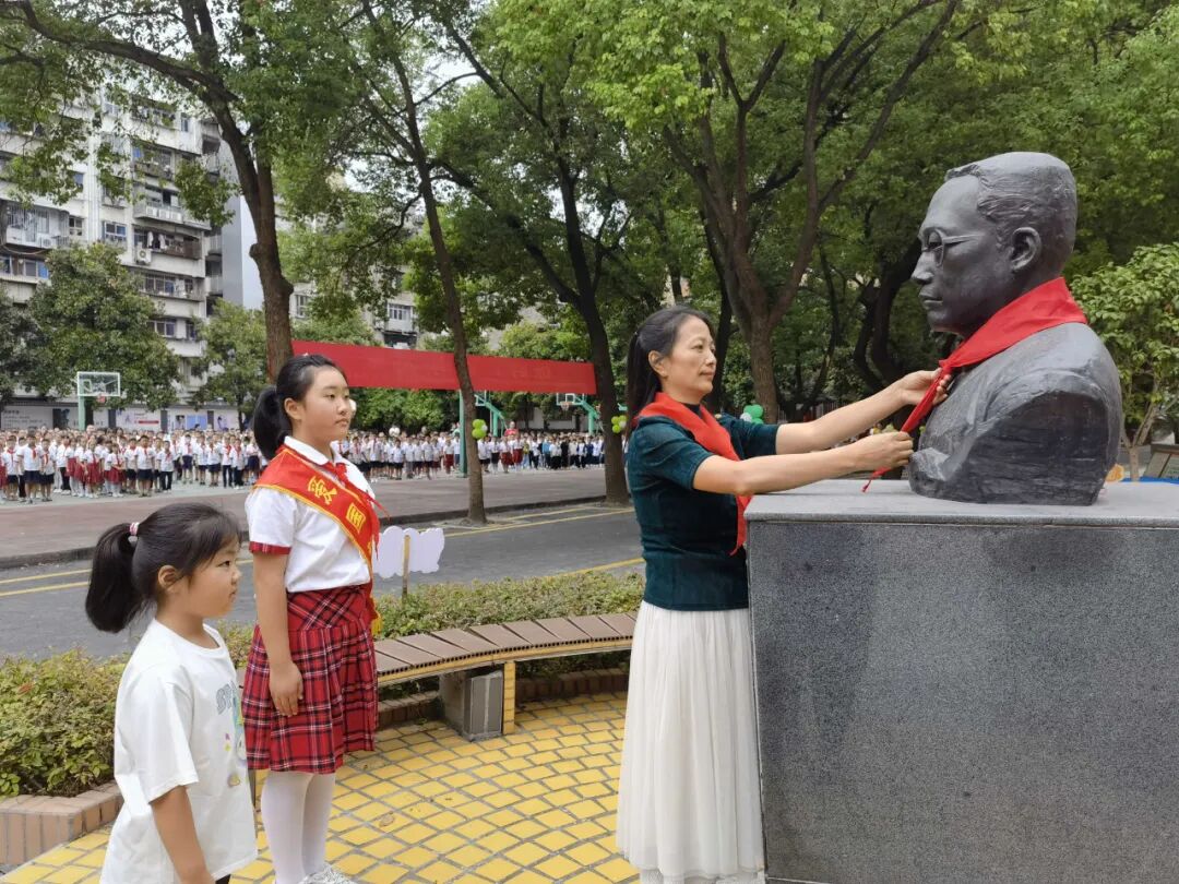 西陵区得胜街小学校长黄敬带领学生代表向陶行知塑像敬献红领巾,引导师生传承学校“真”文化,学习真本领,逐梦新时代。