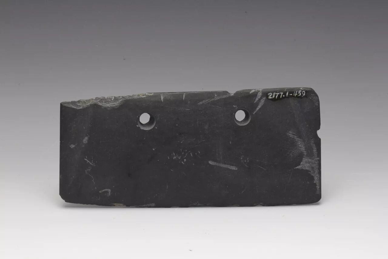 这把石器深灰色,器呈长方形,一端略窄,双面刃,顶部对钻两个圆孔,刃部、器身有磕缺。