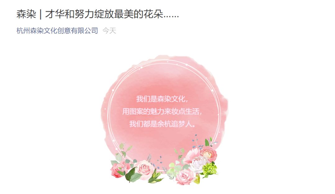 2013年,杭州森染文化创意有限公司在几位中国美术学院的毕业生手中创立。2014年,森染文化进入临平布艺基地,研发方向以印花为核心,突显公司设计师过硬的手绘基本功。