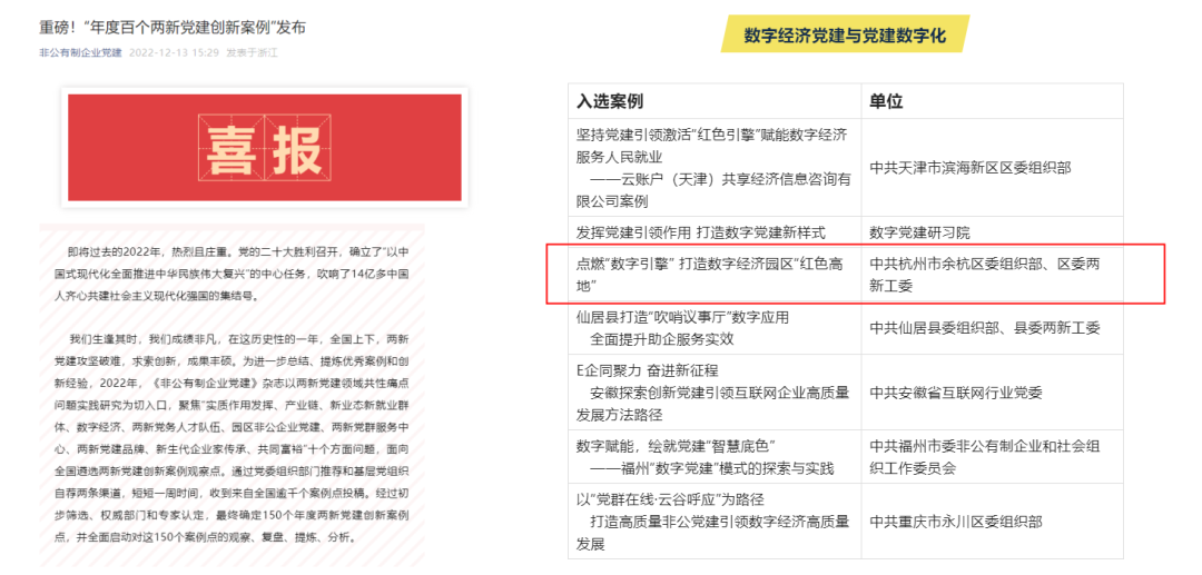 近日,《非公有制企业党建》杂志发布《年度百个两新党建创新案例》,余杭区委组织部(区委两新工委)选送的《点燃“数字引擎” 打造数字经济园区“红色高地”》成功入选案例库。