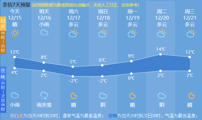 区气象局最新预报,预计明起,较强冷空气将影响余杭,有一次大幅降温、偏北大风和弱雨(雪)天气过程,大家要注意防寒保暖!