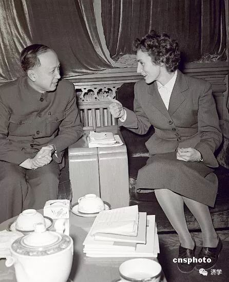 1955年从美国归来的科学家钱学森,在北京与法国原子核物理学家居里夫人的女儿海伦·郎之万交谈
