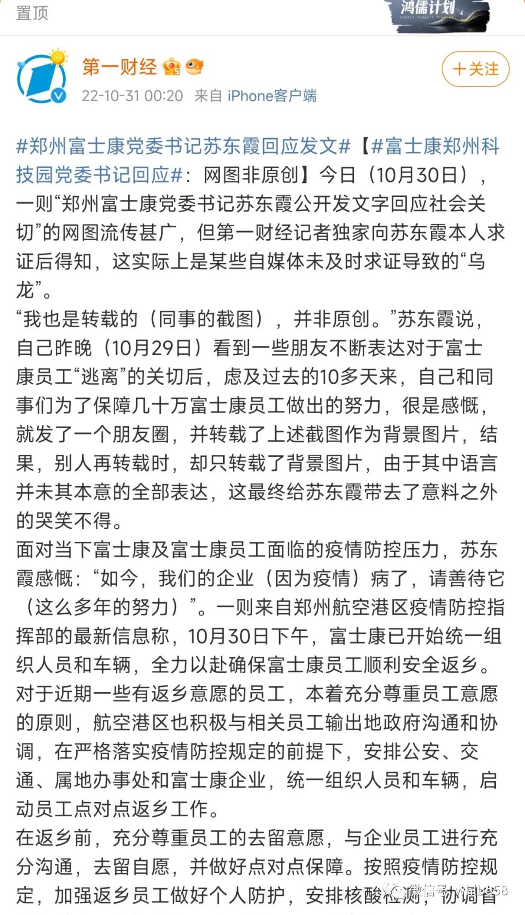 昨天(30日),有关富士康疫情防控乱象成为最热门的头条新闻,其中“富士康党委书记回应”是争议最大的,笔者也写了一篇短评《郑州富士康真有这样的党委书记吗?》(点击蓝色字体阅读)。今天凌晨零点20分,主流媒体《第一财经》官方微博发文就此事件进行“辟谣”,标题为“富士康郑州科技园党委书记独家回应一财:网图非原创”(以下简称“独家”)。