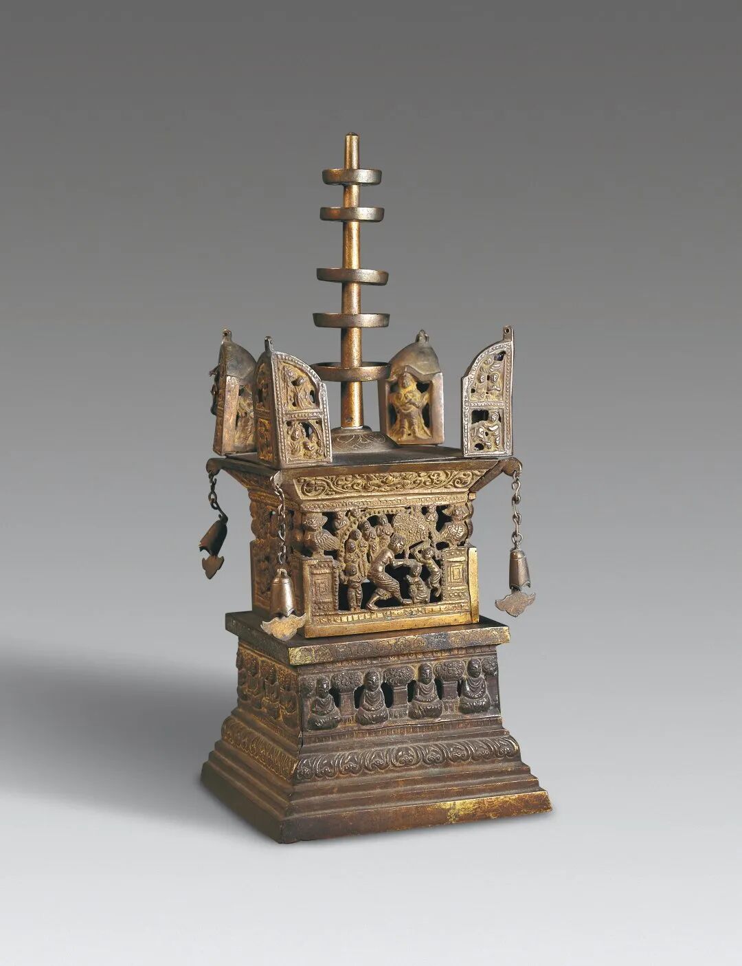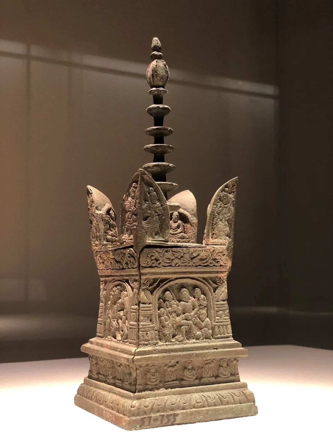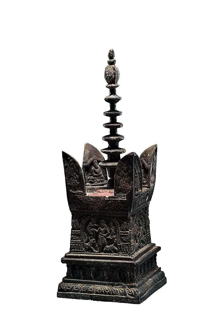 吴越国王钱俶慕古印度阿育王造塔之事,广造阿育王塔并置《宝箧印陀罗尼经》是其“信佛顺天”治国理念的集中体现,也是佛教中国化的一次创新。自后周显德二年(955年)始,钱俶三次造八万四千金涂塔,每塔中藏雕版印刷《宝箧印陀罗尼经》。阿育王塔形制采用中古外来形式,质地多为铜铁,塔上图像装饰以塔身四面佛本生故事与山花蕉叶上佛传故事为核心。