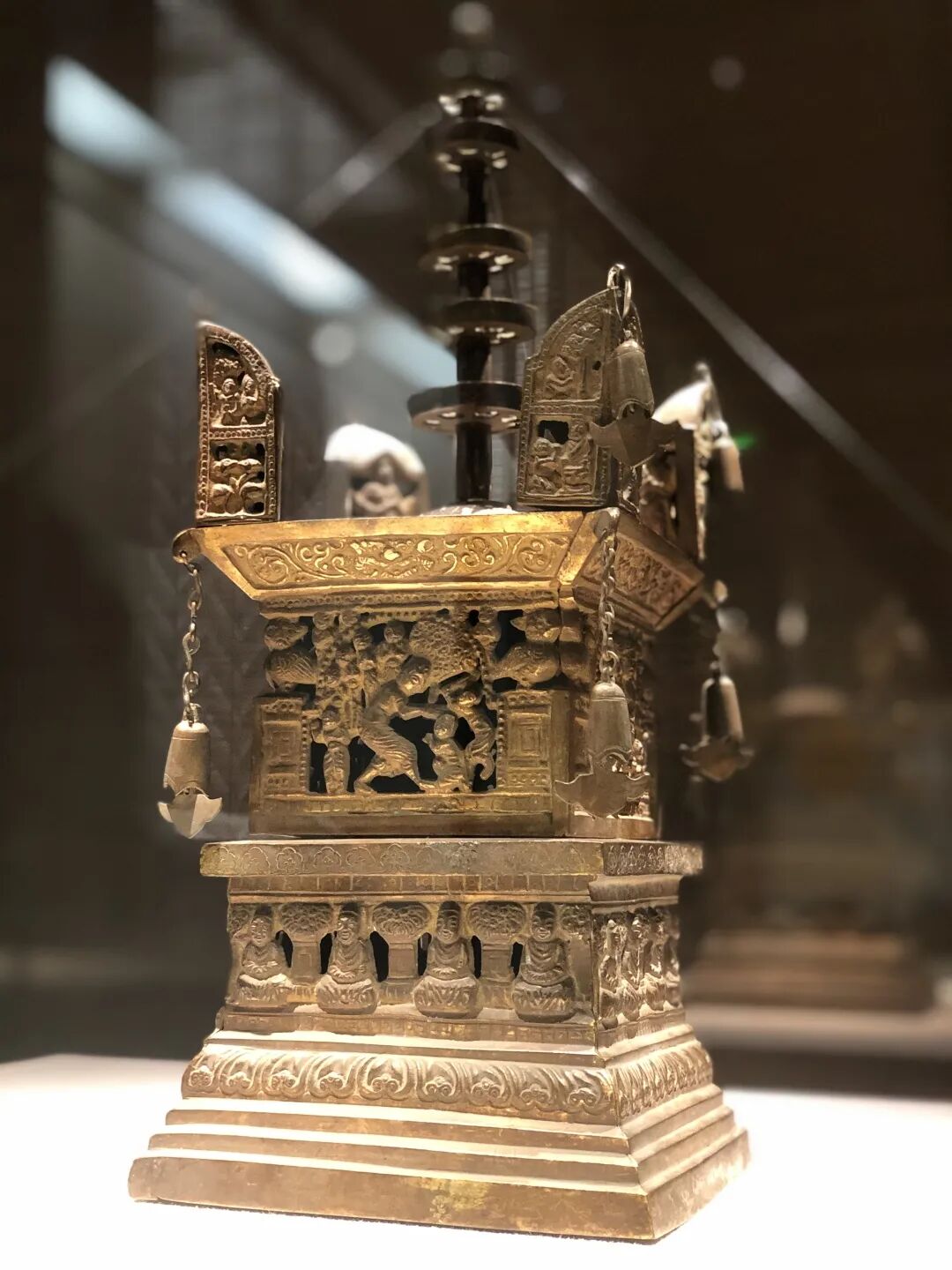 塔由基座、塔身、塔顶三部分构成,均分体铸造拼装。基座四面各开三龛,各饰四尊坐佛,以菩提树相隔;塔身四面饰佛本生故事,四角缀挂风铎;塔顶四角饰山花蕉叶,每角蕉叶外侧饰佛传故事,内侧分立四天王像;刹座饰圆形覆莲;塔刹嵌插在塔身上,相轮残存五重。