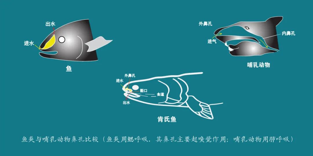 四足型类包括肉鳍鱼中的四足型类和所有的四足动物。与鱼类用鳃呼吸不同,四足型类在“呼吸装备”上有了新的进展——内鼻孔。与外鼻孔相通的内鼻孔是肺呼吸的重要基础,使吸入的空气进入到肺,从而满足身体对氧气的需求。支撑鱼鳍的中轴内骨骼和内鼻孔,使这一群四足型类有条件登上陆地并演化成为后来的四足动物。