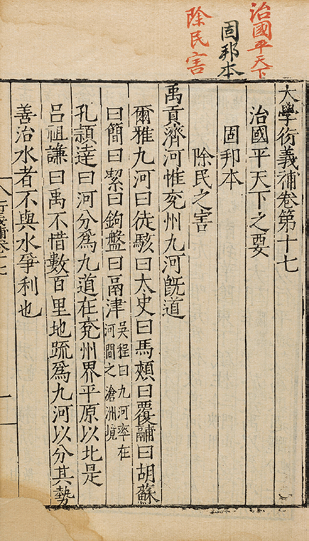 丘濬(1421-1495),字仲深,琼山(今属海南)人。景泰五年(1454)进士,历任礼部尚书、文渊阁大学士等职。丘濬以《大学衍义》缺治国平天下之文,乃博采六经诸史之文,加以抒发己见,续补其阙,著成是篇。成化二十三年(1487)书成,献于孝宗。