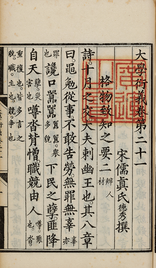 《大学》原为《礼记》一章节,宋儒特为表彰,渐独立成书。南宋真德秀征引经训,参证史事,旁采先儒之论,以己意发明之,著成是书,并献于宋理宗。是书论及格物、致知、诚意、正心、修身、齐家诸义。真德秀(1178-1235),字景元,后改希元,号西山,建州浦城(今属福建)人。庆元五年(1199)进士,历任知福州兼福建安抚使、参知政事等职。