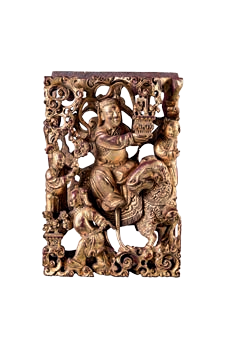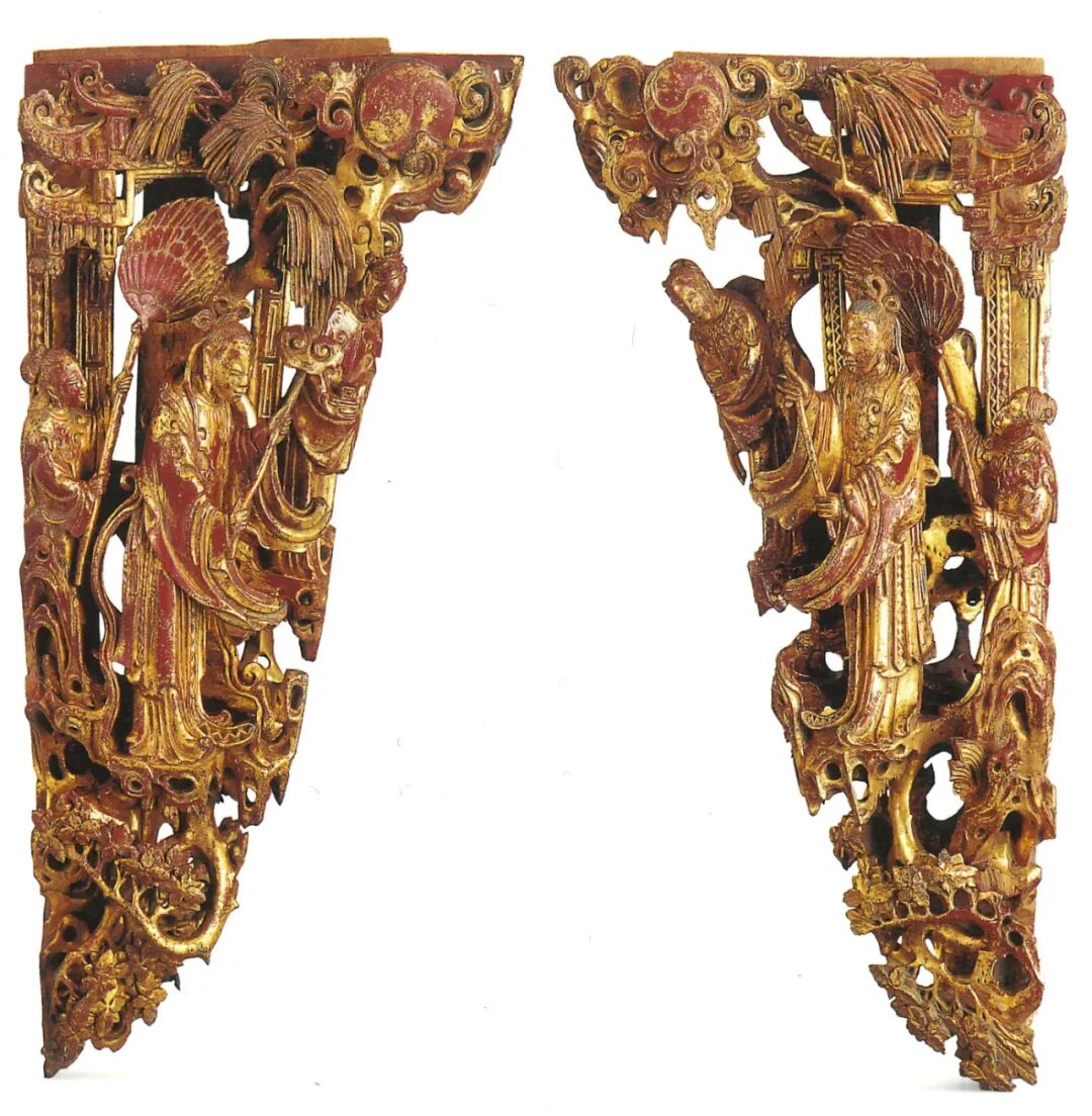 神龛构件,嵌在正面龛内两侧。八仙作为家喻户晓的道教神仙,因皆为凡人成仙,有着多彩多姿的凡间故事和成仙传说,深受民众喜爱。八仙在明以前说法不一,有汉代八仙、唐代八仙、宋元八仙,所列神仙各不相同。明代吴元泰《东游记》始定为“上洞八仙”并排了顺次 :一、铁拐李,二、钟离权,三、蓝采和,四、张果老,五、何仙姑,六、吕洞宾,七、韩湘子,八、曹国舅。清代民国基本沿用这一说法。