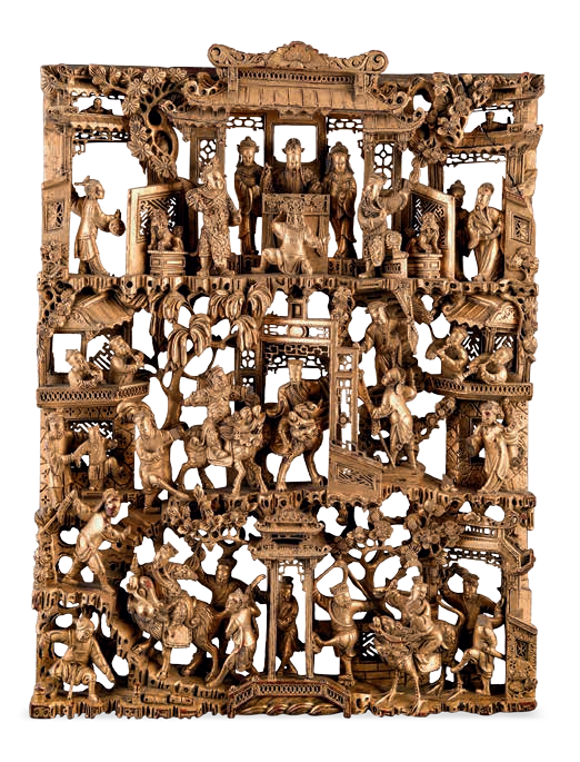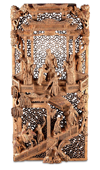 双层通雕,底纹为几何花纹,主画面雕刻一家人喜迎福禄寿三星临门,禄星居中,寿星柱杖捧桃,福星送子,代表着人世间期盼的各种幸福的总和。