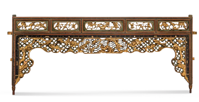 神龛龛门直肚。花条应为一对,此为其中一件。画面以四种植物将八仙中的钟离权、张果老、吕洞宾、何仙姑分为四组图案,自上往下排列,坐骑分别为麒麟、狮子、马、鹿。