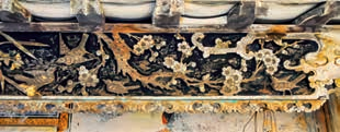 金漆木雕祝寿屏风局部的回纹、夔龙纹