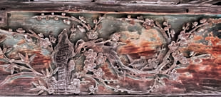 花鸟是金漆木雕题材里最常出现的元素。有单独以花卉为主的,如象征中国传统文化理想人格的“岁寒三友”“四君子”等。花鸟组合更为常见,特定的花鸟组合往往有特殊寓意。喜鹊和梅花的组合,叫“喜上眉梢”,也叫“喜鹊登梅”,“梅”与“眉”谐音,喜鹊名有“喜”字,在民间被视为报喜之鸟,故以喜鹊落在或飞在梅花树枝上比喻喜事将至。