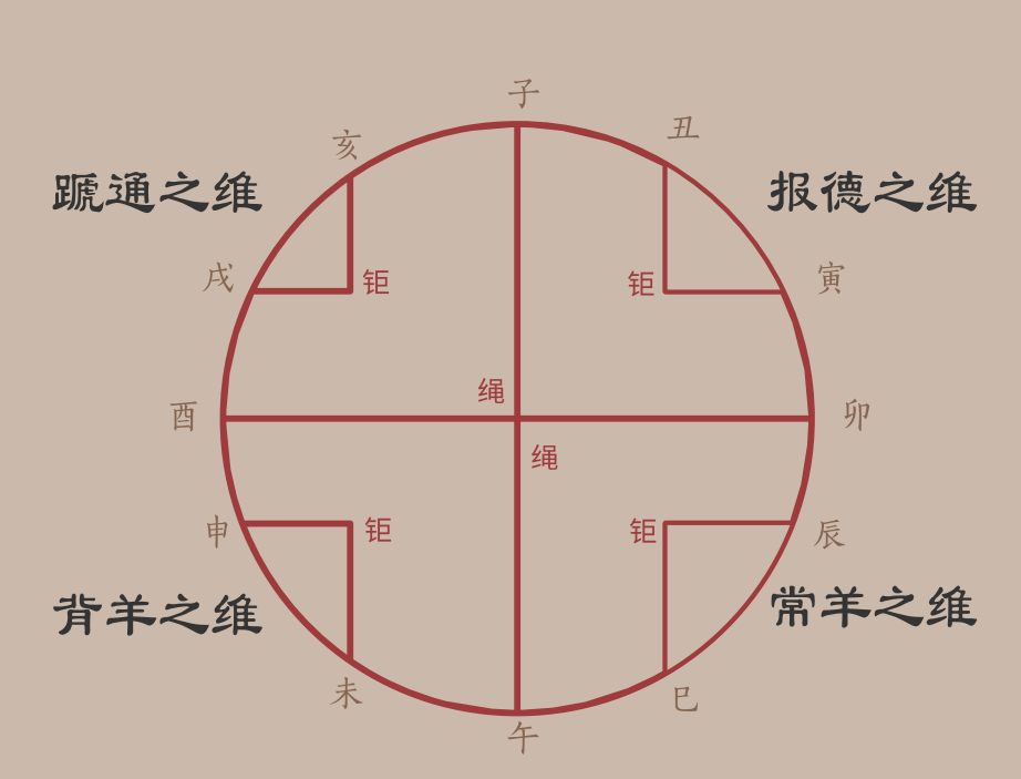 “子午、卯酉为二绳,丑寅、辰巳、未申、戌亥为四钜,东北为报德之维、东南为常羊之维,西南为背羊之维、西北为蹏通之维。”