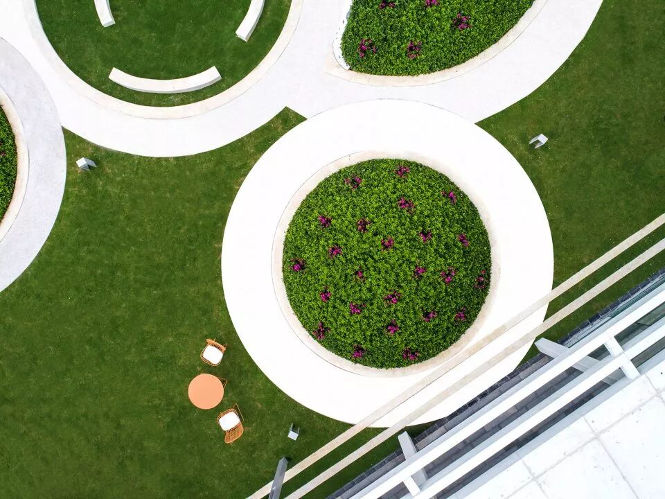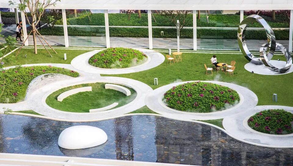 游园空间由四个球形种植(毛杜鹃)和一个下凹绿地组成,塑造出了有趣蜿蜒的散步休憩小径,设计想通过相对回旋流转的动线,变相地让人放慢自己的脚步,或驻足于水岸边凝望,或沉醉于毛杜鹃丛中的芳香和雾喷仙境中,或远望于双莫比乌斯环雕塑。