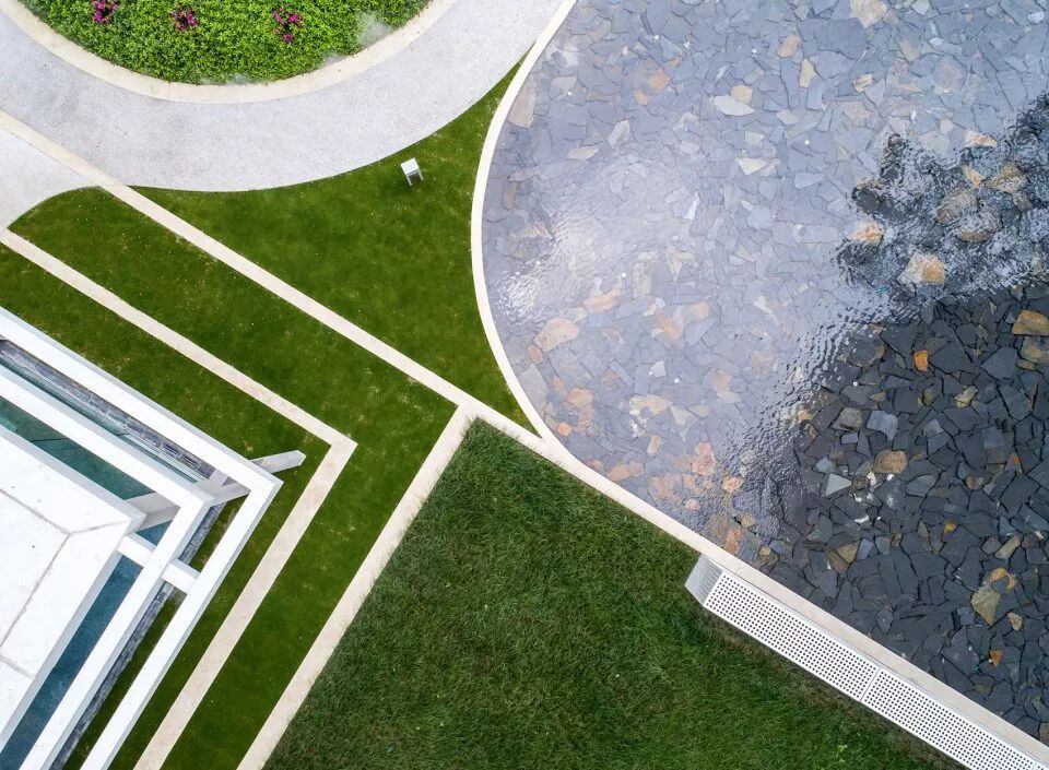 镜子一般的水面无限延伸竖向维度,获得更立体的空间,并将归家的内心第一时间沉淀下来,映出瞬间宁静与安心,三个浮于水面之上的玻璃钢雕塑小品,也是是品质江景生活的浓缩写照,与此同时,时不时起跳的喷泉, 给人们带来一丝惊喜感和期待。水景底部的深灰色片岩,让池底显得更为沉稳,让倒影感以及镜面效果更突出,同时,片岩天然的色差增加了一丝丰富性。