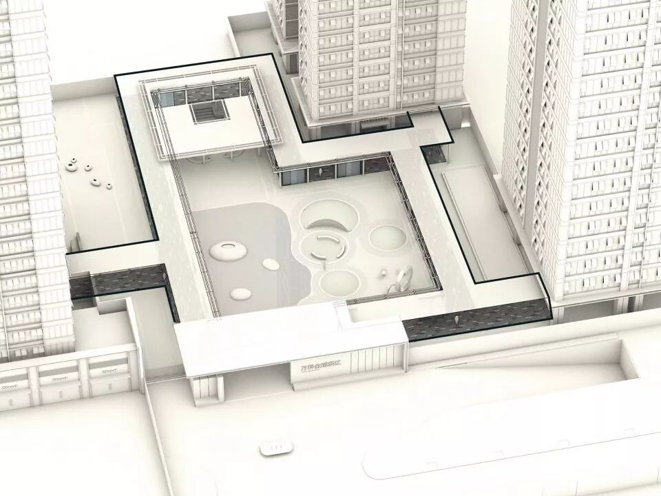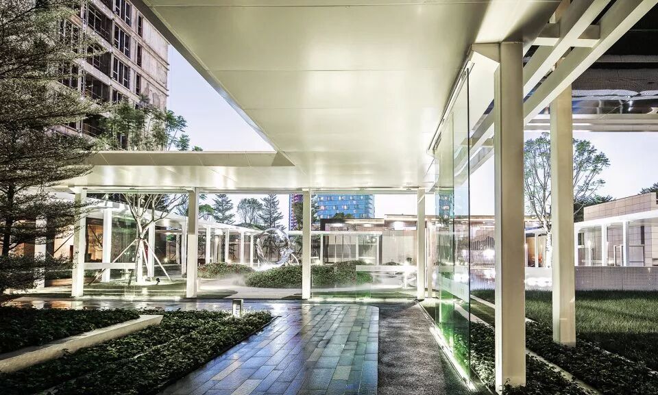 回廊空间将首开区的三栋楼的入户空间串联了起来,成为人们快速归家的便捷动线。4m高的白色单臂悬挑廊架增强了通透性和透光性, 减少了压迫感,同时将架空层空间与庭院空间从视线上连接了起来,又对整个中心庭院起到了框景作用,成为一个360度无死角的景观环廊。