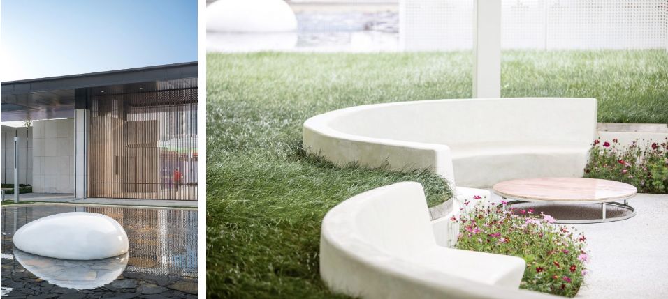 白色系: 水磨石 + 白色铝板 + 玻璃钢 (这些材料的整体感较强,不需要接缝或较少,更有助于表达白色的纯粹)