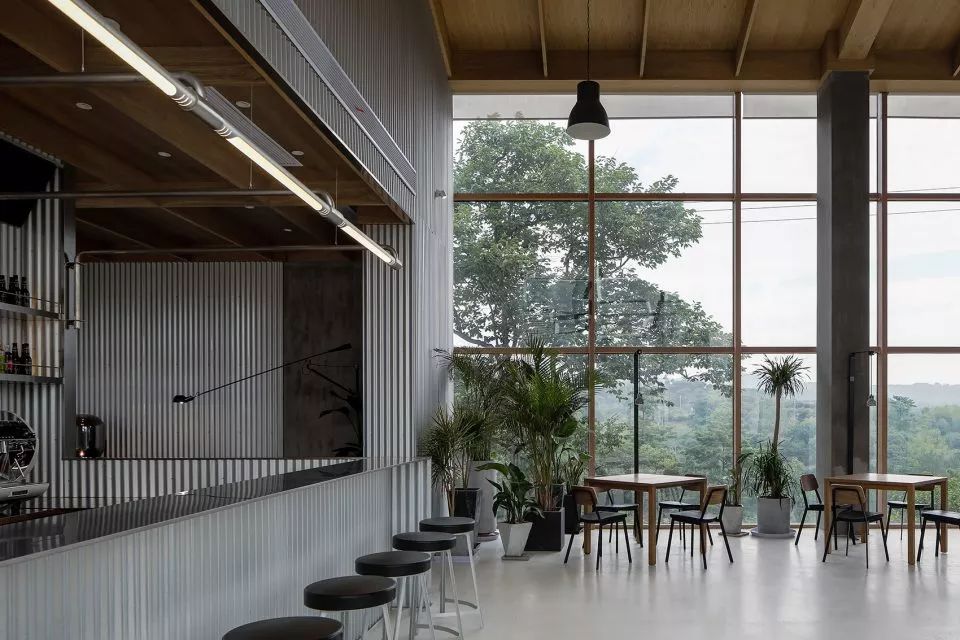 餐厅是本项目最具复杂性的空间。该空间包含了聚会、用餐、入住办理、洽谈等功能。 由三个高低不一的建筑组合而成,中段留有10米的挑高空间,两边是8米落地窗。面对繁茂的植被和图画感极强的自然景观,我们希望通过材料的物理性营造人工与自然的高强度碰撞以及一种直觉的、潜意识的、肌体上的平衡感。并在内部创造出与外部一样的开放性,提供一瞬间便令人印象深刻的休憩之所。