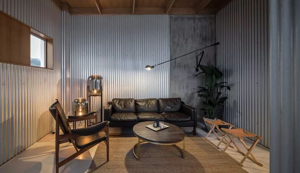 主要用材:镀锌波纹板、水磨石、木饰面、黄铜不锈钢、竹木条