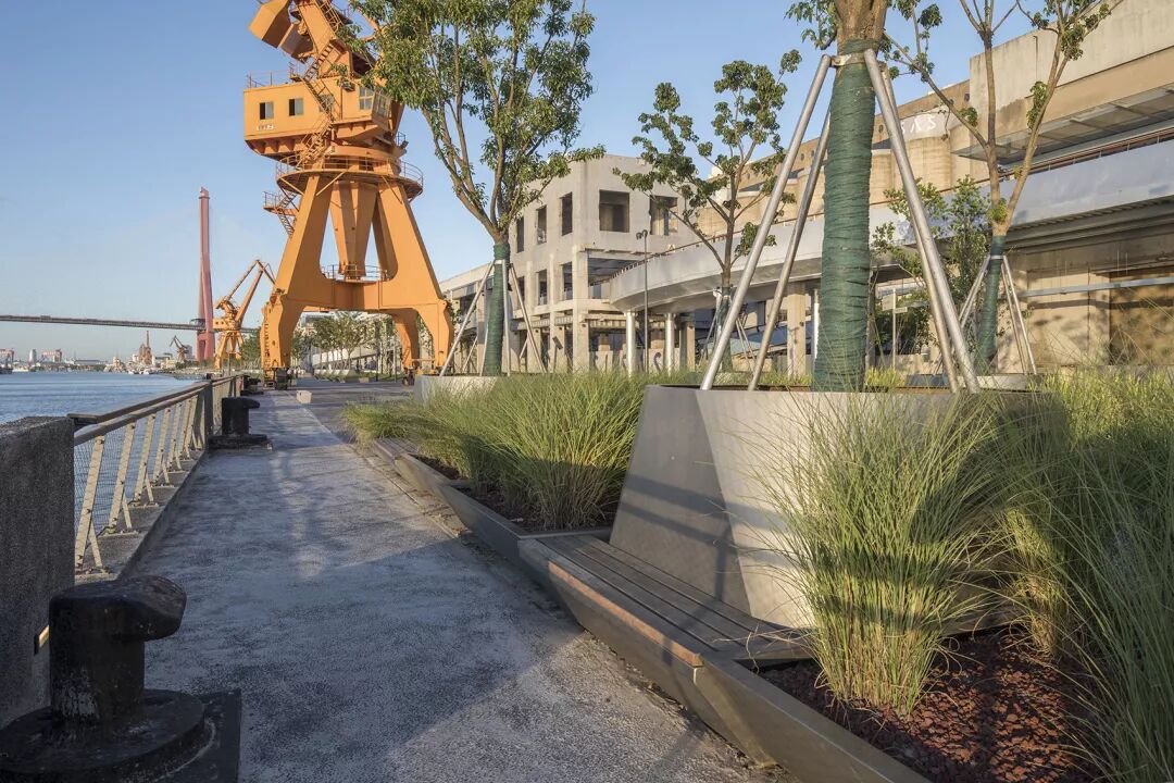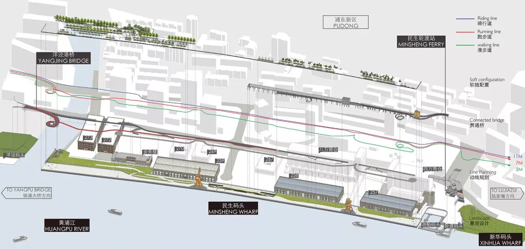 民生码头贯通景观设计,东侧连接洋泾港云桥,西侧贯通民生轮渡站区域,并连接新华滨江绿地。基于城市设计的整体性和延续性,通过低线慢步道,中线跑步道,高线骑行道“三线贯通”的设计手法,创造丰富多样的慢行空间及游赏体验。
